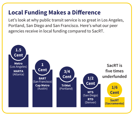 During Action Team discussion of our presentation to SacTA (Sacramento Transportation Authority) at their December 13 meeting, people asked exactly what SacRT wants out of a new Measure B for the 2020 ballot. We have heard from SacRT in meetings, and in emails, about what their priorities are, but have not come across an official document. So we will be speaking about the funding streams we want to see: operations, maintenance, and projects which we have already discussed and support, rather than referring to a specific ask that SacRT has made.