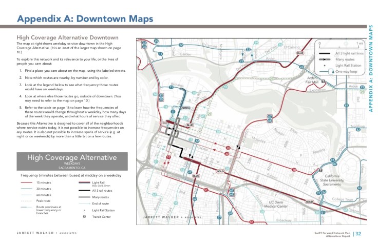 At our recent Action Team meeting, several people commented on the downtown maps, which we have not previously posted. So, here they are. Each graphic links to a pdf page which was extracted from Appendix A of the SacRT Forward Alternatives Report. The maps are not remarkably different, but there are differences if you study them closely.