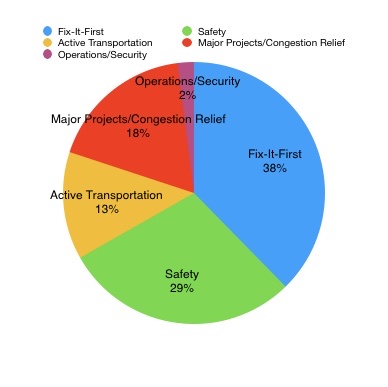 At first glance, the list of projects (in the staff document) submitted by Sacramento to SacTA looks better than it has in the past, but there is still a ways to go. Congestion relief should be achieved by shifting trips away from private vehicles and to transit, walking, and bicycling. Building new lanes miles and new interchanges does not relieve congestion, it induces more traffic. New bridges may or may not relieve congestion, but there is an argument to be made that Sacramento has too few river bridges and circulation for all modes of travel would be improved by more bridges, so long as they have limited or even no private car capacity. The chart below shows the distribution of projects in six categories, which were determined by the city.