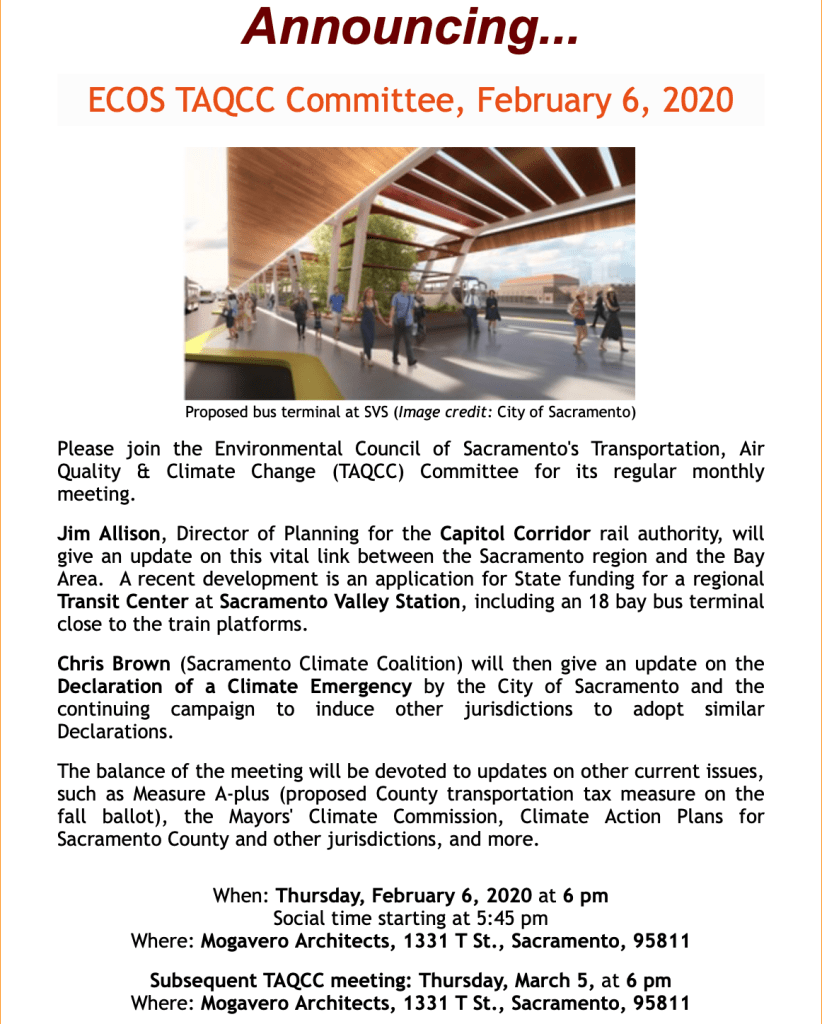 The ECOS-TAQCC (Environmental Council of Sacramento – Transportation, Air Quality, and Climate Change) upcoming meeting will have some additional information about the changes being proposed to Sacramento Valley Station, apropos to our previous post on SVS and TIRCP.