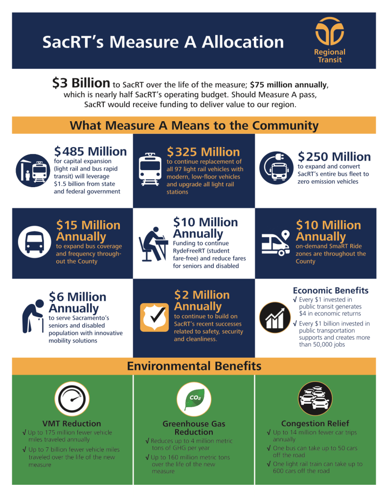 SacRT has published a one-page about what they would do with the share from the potential Measure A transportation sales tax measure. SacRT’s share is somewhat less than 40%, as part of the ‘transit’ allocation would go to regional rail. Check the graphic below or download the pdf.