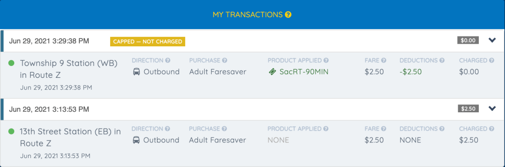 My charge showed up in the LittlePay system as below. Discount fares, such as disabled and senior, are not yet available in this system.