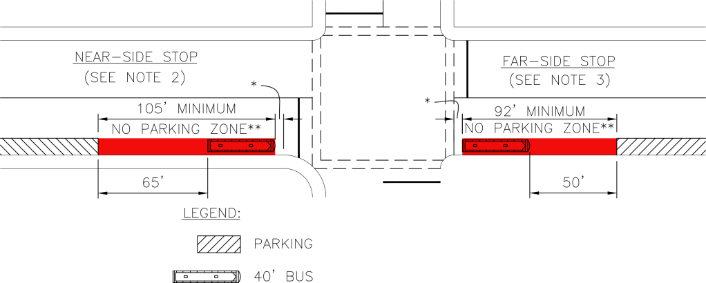 Bus stops are supposed to have red curbs to define the no-parking zone, but some stops do not. Even when the curb is painted red, many people ignore it. People parking in bus stop areas is an ongoing problem along streets with retail business. Some people claim they are stopping ‘just for a moment’, but if that moment happens to be when the bus comes, riders cannot safely board or debark the bus. The bus driver will do the best they can, but it involves safety risks for the passengers, bus driver, and the bus itself. Other people just plain park at bus stops, and don’t care.
