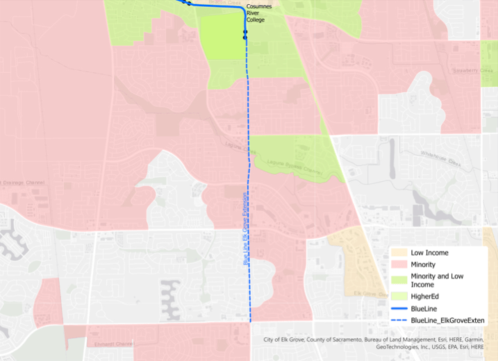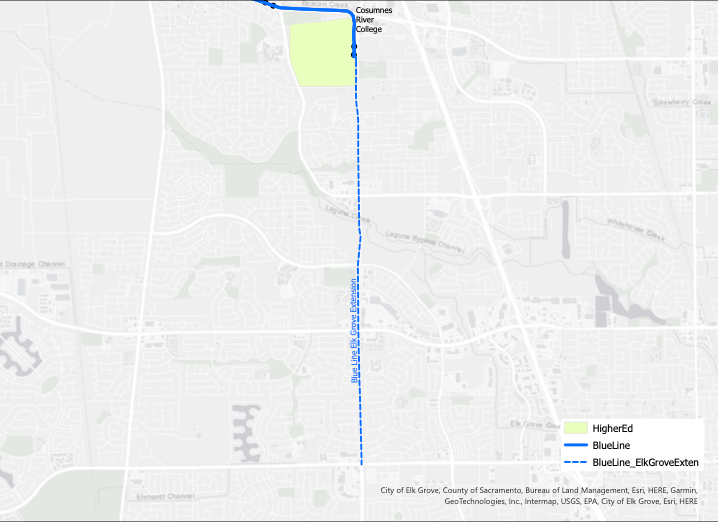The Blue Line was extended to Cosumnes River College in 2015. There is a proposal for a ‘South Sacramento Phase 3’ extension into the City of Elk Grove. There are various routes that have been proposed, by SacRT and the city, but there doesn’t seem to be one official route. The one used here follows Bruceville Road south to Elk Grove Blvd (pdf). There are versions that continue east on Elk Grove Blvd, and others which follow Big Horn Road. So far as is known, SacRT has not started an environmental review document that would define one or more potential routes. However, the extension is mentioned in several funding documents.