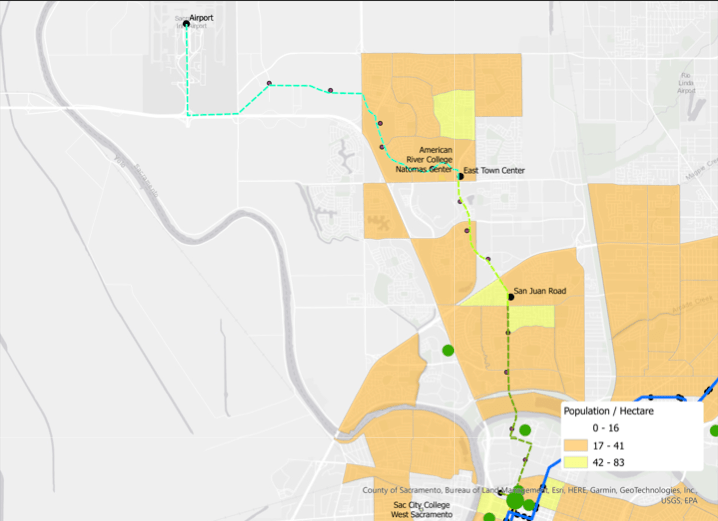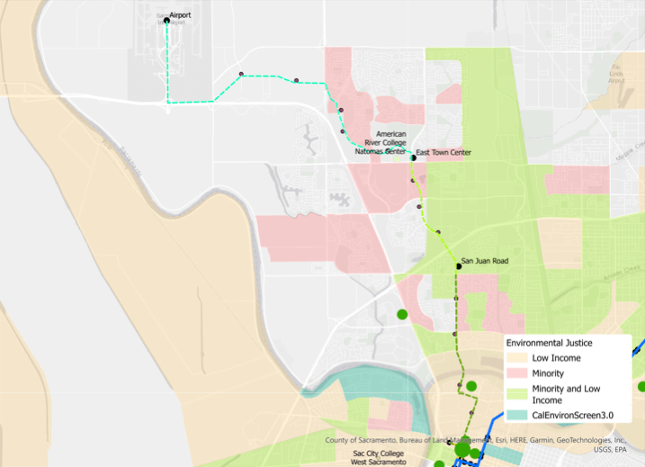 Environmental justice, as documented by the SACOG environmental justice (low income high minority LIHM) dataset, indicates that the first segment to San Juan Road serves these areas well, the second segment to Del Paso Road somewhat, and the last segment to the airport not all. (pdf)