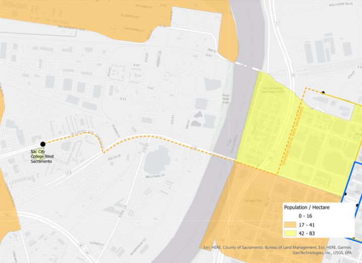 Nevertheless, continuing with the STAR project of looking at each potential light rail extension, here are the base, density, environmental justice, and median household income maps for the West Sacramento extension, with the route based on going to the city hall area.