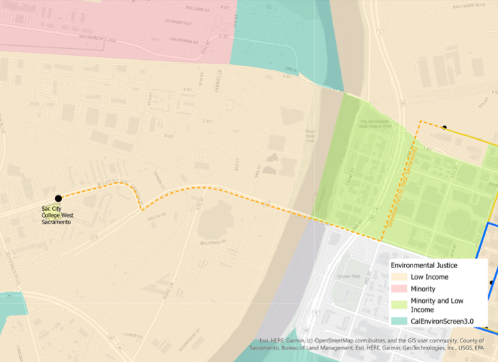 The SACOG Environmental Justice (low income high minority LIHM) feature indicates low income throughout the service area on the west side of the river, and minority and low income on the east side. This provides justification for the extension. (pdf)