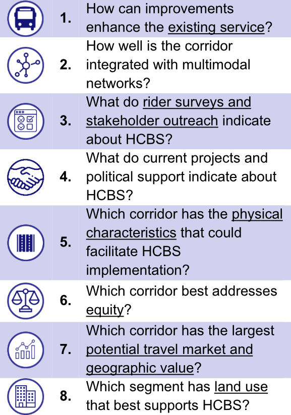 Each corridor was identified for specific improvements to service, through operations and infrastructure. The corridors proposed for improvement are mapped below.