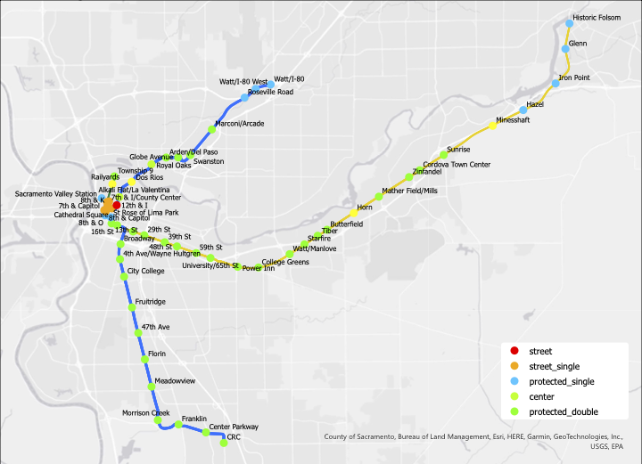 Several infill stations, within the current light rail system, have been proposed. The Dos Rios station is the only one funded. (yellow)