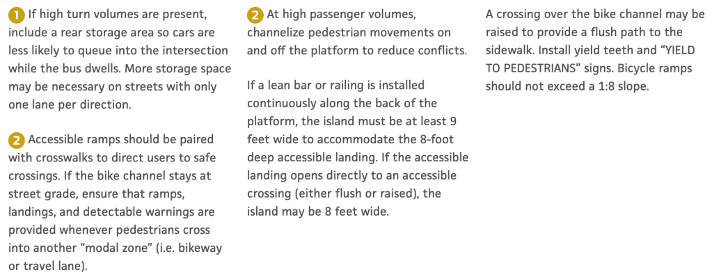 Though STAR does not have a policy, we believe that transit boarding islands with bikeways between the island and the sidewalk are should be considered at every location. The diagram below, with the text following, is from the NACTO Transit Street Design Guide, Side Boarding Island Stop page. The guide can be purchased, but is also available online.