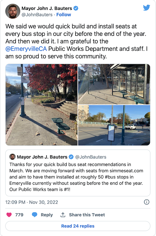 Emeryville has recently received widespread commendation for installing seating at every one of the bus stops in the city. The effort, led by Mayor John Bauters after observing a rider having to lean against a trash can while waiting for the bus, and implemented by the city’s public works department, the simple seating has solved of transit riders most frequent complaints: no place to sit while waiting. See Streetblog USA post: https://usa.streetsblog.org/2022/12/21/what-it-takes-to-put-a-seat-at-every-bus-stop-in-town/