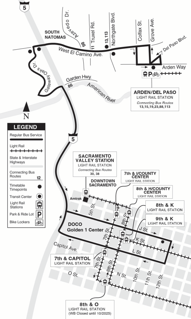 The area north of the American River, which the Truxel Bridge would serve with light rail and perhaps bus service, is currently served by four bus routes. Route 11 Natomas/Land Park (45 minute frequency) serves south and north Natomas, mostly along Truxel Road. Route 13 Natomas/Arden (45 minute frequency) serves south and north Natomas, mostly along Northgate Blvd, Del Paso Road, and Truxel Road. Route 86 Grand (30 minute frequency) serves south Natomas. Route 88 West El Camino (30 minute frequency) serves south Natomas, mostly along West El Camino Blvd. 45 minute frequency is usually considered unacceptable level of service. Routes 11, 86, and 88 use the I-5 bridge to cross the American River, while Route 13 does not cross the river.