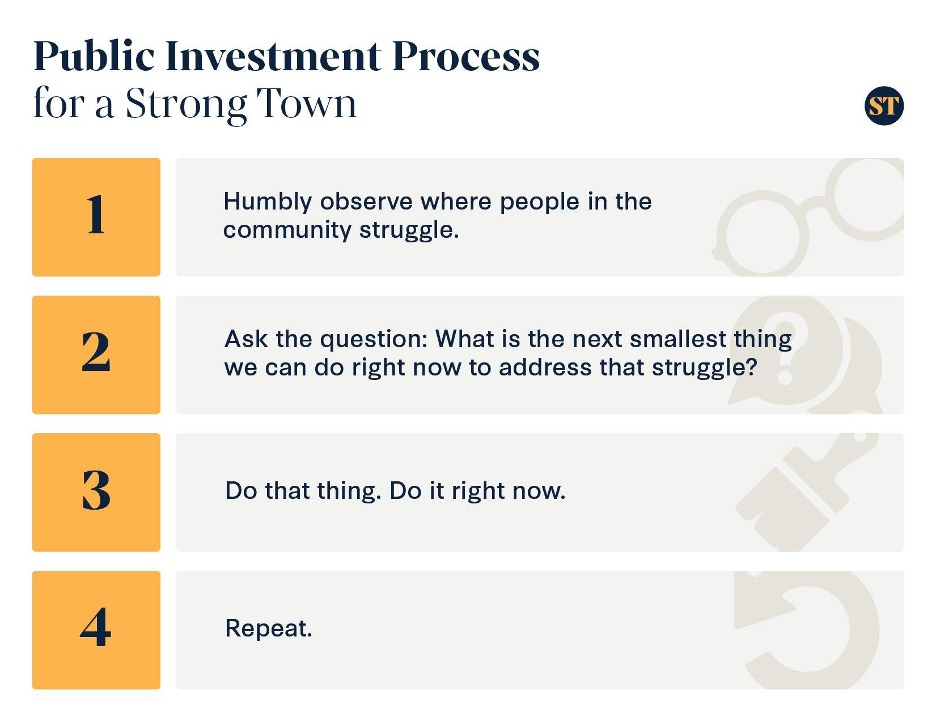 Three members of Strong SacTown introduced themselves to the board during ‘items not on the agenda’ public comment. Strong SacTown is the local conversation (affiliate) of the Strong Towns national organization. Jenny Mital introduced the concept of next smallest step, rather than big projects, which is one of the key concepts in the Strong Towns movement. The graphic below shows this key concept.